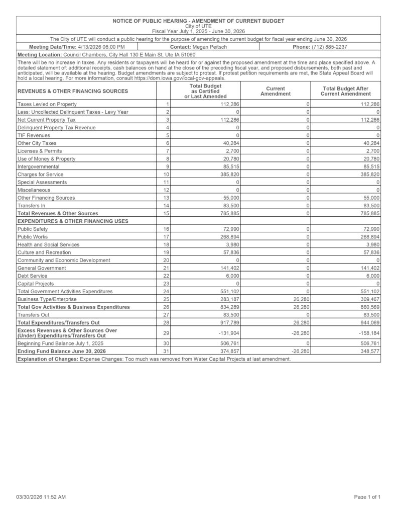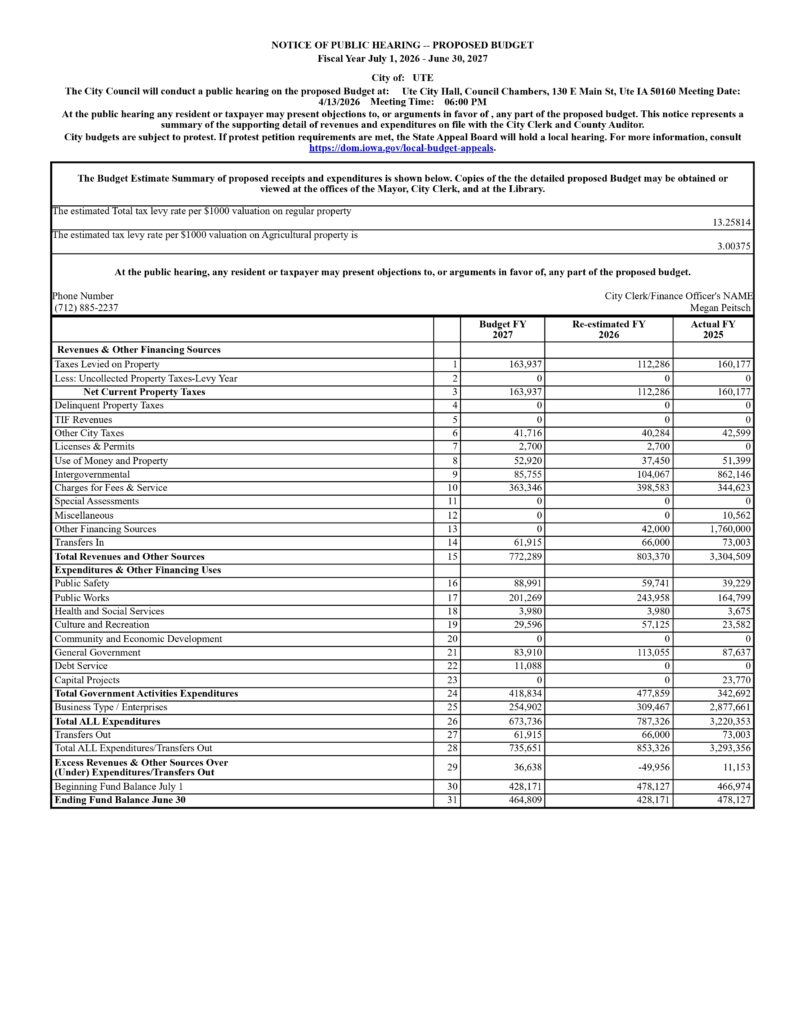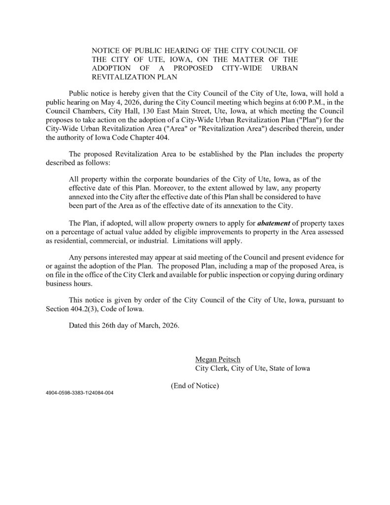 Welcome to the City of Ute! We are located in the west central part of Iowa in Monona County along the Soldier River. We are located 55 miles South of Sioux City 70 miles North of Omaha, NE. With the highways 183 and 141 meeting in Ute, it’s easy to reach the bigger cities, while still enjoying all that small-town life has to offer. We have a population of 374 (2010 census).