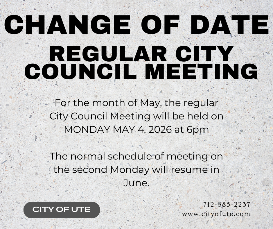 Notice: There is a change of date for the regular City Council Meeting for the Month of May. May’s meeting will be on Monday May 4, 2026 at 6pm. The normal schedule of regular meetings on the second Monday will resume in June.