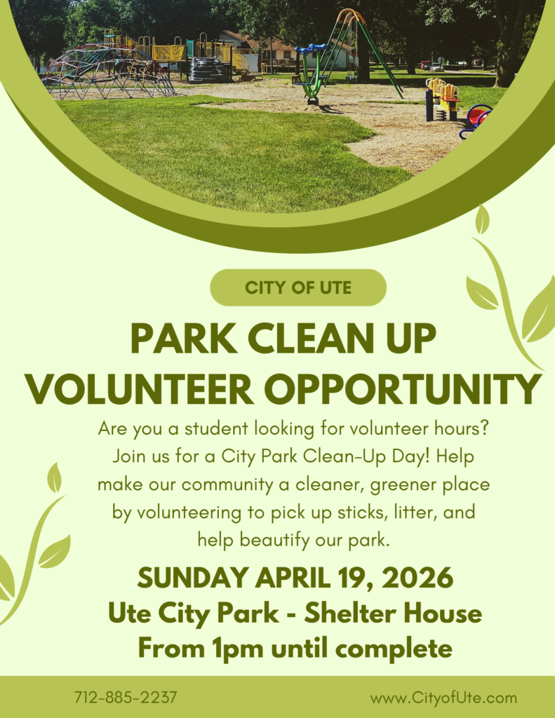 Students! Are you looking for an opportunity for community service hours or just want to help out? Join us for a Park Clean-Up Day on Sunday April 19th at the Ute City Park Shelter House from 1pm until done. The more hands we have, the faster the work will go. Picking up sticks, litter, and other beautifying tasks will be completed that day. No need to sign up, just show up. We’ll see you there!